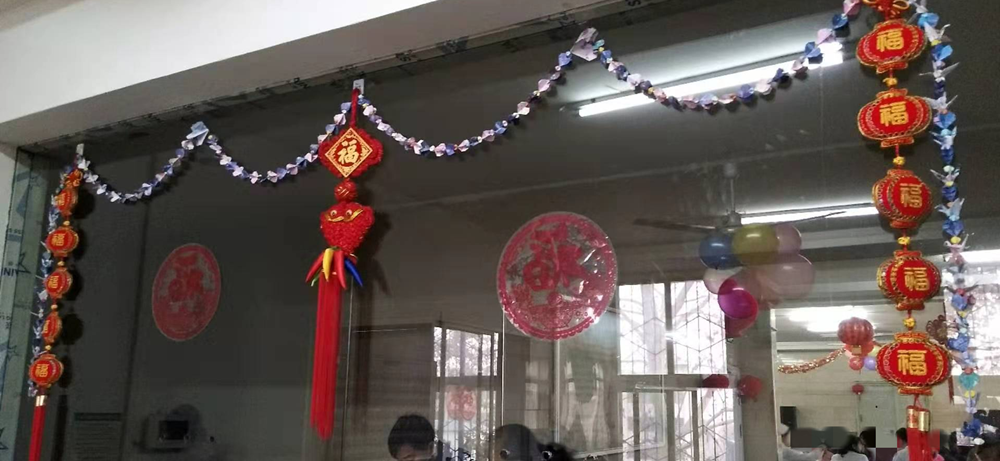 早上工作人员与病友们一起装饰病区,吹气球、挂灯笼、贴春联、粘福字,不一会儿,洋溢着浓浓年味的舞台展现在大家面前,用折纸穿起来的千纸鹤和爱心,祈福着来年的身体健康,每个人的脸上都流露出幸福的微笑。